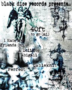 40 FT TO GO, I HATE MY FRIENDS, A DOLL FOR ABIGAIL, CABLEKNIT, PERFECT sam farmer 40 FT TO GO, I HATE MY FRIENDS, A DOLL FOR ABIGAIL, CABLEKNIT, PERFECT When Sat, February 28 6:30 pm Add To Calendar Download ICS Google Calendar iCalendar Office 365 Outlook Live Where Casa Cafe 2025 S Western Ave, Chicago, Illinois, 60608 Event Type All Ages Map Unavailable Show info 40 FT TO GO, I HATE MY FRIENDS, A DOLL FOR ABIGAIL, CABLEKNIT, PERFECT $10-15 pwyc Doors 6:30/show 7
