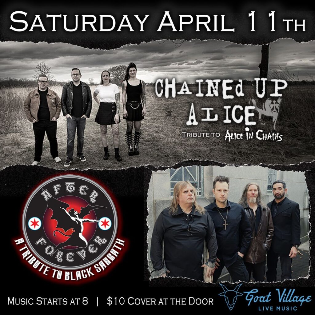 AFTER FOREVER, CHAINED UP ALICE Rodney Pawlak AFTER FOREVER, CHAINED UP ALICE When Sat, April 11 8:00 pm Add To Calendar Download ICS Google Calendar iCalendar Office 365 Outlook Live Where Goat Village 4701 N Cumberland Ave, Norridge, Illinois, 60706 Event Type 21+ Loading Map.... 4701 N Cumberland Ave - NorridgeEvents 41.964858 -87.835481 Chained Up Alice and After Forever head to Norridge, IL for a night of Alice in Chains and Black Sabbath music at Goat Village! Music starts at 8, $10 cover at the door.