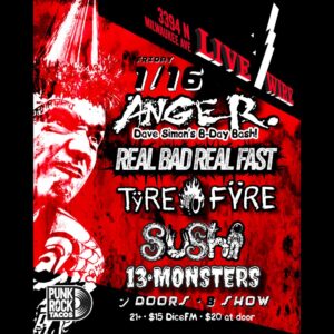 ANGER., REAL BAD REAL FAST, TYRE FIRE, SUSHI, 13-MONSTERS Rodney Pawlak ANGER., REAL BAD REAL FAST, TYRE FIRE, SUSHI, 13-MONSTERS When Fri, January 16 7:00 pm Add To Calendar Download ICS Google Calendar iCalendar Office 365 Outlook Live Where LiveWire Lounge 3394 N Milwaukee Ave, Chicago, Illinois, 60641 Event Type 21+ Loading Map.... 3394 N Milwaukee Ave - ChicagoEvents 41.942821 -87.730414
