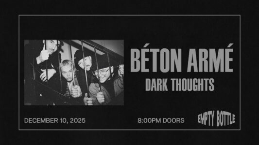 BÉTON ARMÉ, DARK THOUGHTS sam farmer BÉTON ARMÉ, DARK THOUGHTS When Wed, December 10 8:00 pm Add To Calendar Download ICS Google Calendar iCalendar Office 365 Outlook Live Where Empty Bottle 1035 N Western Ave, Chicago, Illinois, 60622 Event Type 21+ Loading Map.... Empty Bottle1035 N Western Ave - ChicagoEvents 41.900476 -87.686635 Tickets BÉTON ARMÉ, DARK THOUGHTS @ Empty Bottle $20.39 (15 + fees) 21+ Béton-Armé-dark-thoughts