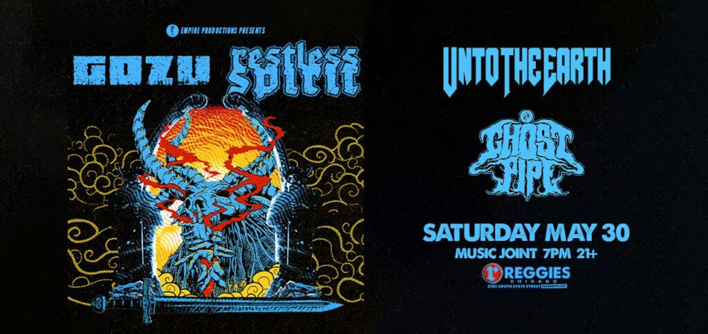 GOZU, RESTLESS SPIRIT, UNTO THE EARTH, GHOST PIPE Rodney Pawlak GOZU, RESTLESS SPIRIT, UNTO THE EARTH, GHOST PIPE When Sat, May 30 7:00 pm Add To Calendar Download ICS Google Calendar iCalendar Office 365 Outlook Live Where Reggies Music Joint 2105 S State St, Chicago, Illinois, 60616 Event Type 21+ Loading Map.... 2105 S State St - ChicagoEvents 41.853951 -87.62679 Reggies Music Joint | Saturday May 3021+ | 7pm Doors 8pm Show GOZURESTLESS SPIRITUNTO THE EARTHGHOST PIPE https://www.reggieslive.com/show/gozu-2/