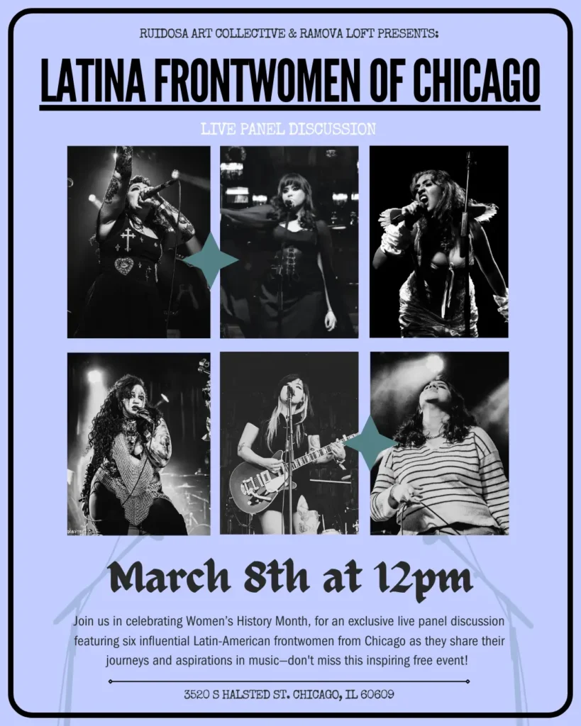 Latina Frontwomen of Chicago Rodney Pawlak Latina Frontwomen of Chicago When Sun, March 8 12:00 pm Add To Calendar Download ICS Google Calendar iCalendar Office 365 Outlook Live Where Ramova Theatre 3520 S Halsted St, Chicago, Illinois, 60609 Event Type All Ages Map Unavailable free event Ruidosa Art Collective x Ramova Theatre Presents: Latina Frontwomen of Chicago Sun, Mar 8 at 12:00 PM CDT at Ramova Loft