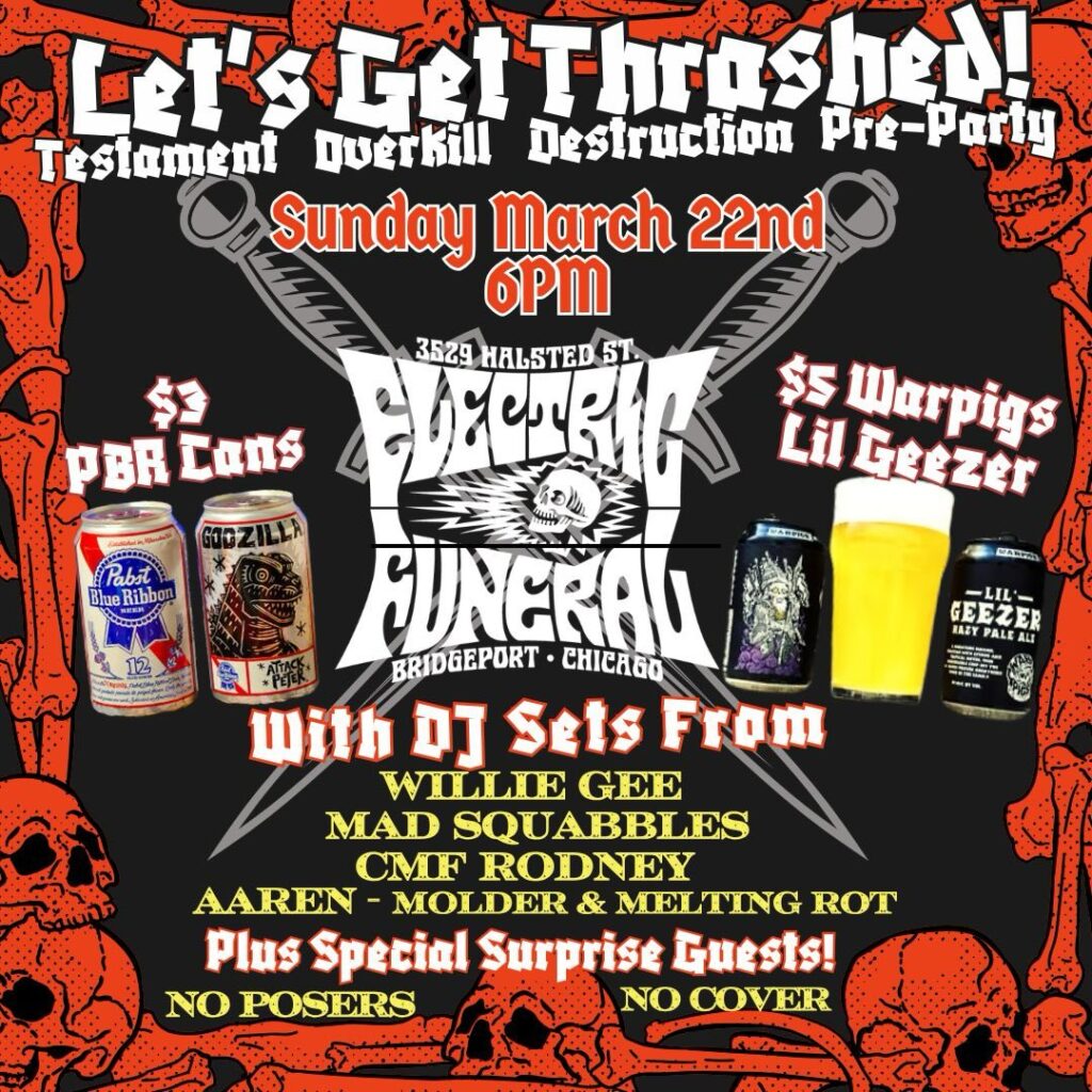 party before and after the TESTAMENT show Rodney Pawlak party before and after the TESTAMENT show When Sun, March 22 8:00 pm Add To Calendar Download ICS Google Calendar iCalendar Office 365 Outlook Live Where Electric Funeral 3529 S Halsted St, Chicago, Illinois, 60609 Event Type 21+ Loading Map.... 3529 S Halsted St - ChicagoEvents 41.829835 -87.645829 party before and after the TESTAMENT show across the street from the Ramova at Electric Funeral