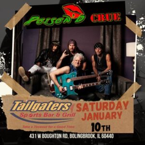 POISON’D CRUE Rodney Pawlak POISON’D CRUE When Sat, January 10 8:00 pm Add To Calendar Download ICS Google Calendar iCalendar Office 365 Outlook Live Where Tailgaters 431 W Boughton Rd, Bolingbrook, Illinois, 60440 Event Type 21+ Map Unavailable Poison’d Crue at Tailgaters Sports-Bar Playing all your Favorites from Poison, Motley Crue, GNR, Bon Jovi, Tesla, Def Leppard plus many more!