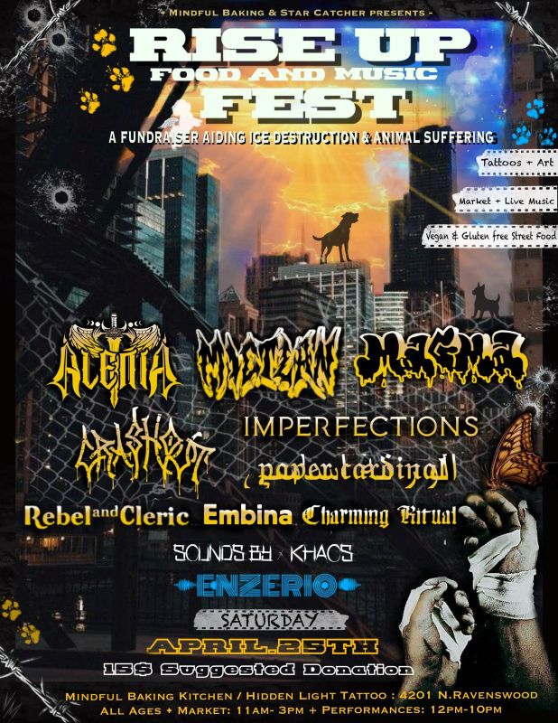 Featuring a market of vendors, vegan & cruelty free street food, art, tattooing, live music, live interviews, meet & greet with all the bands, & nearly 12 hours of the best kind of chaos. Incorporating an entire variety of genres including Metal, Punk, Hardcore, Rock, Darkwave, House, Cumbia, & more. Supporting the cause & supporting a highlight of Chicago’s Underground.