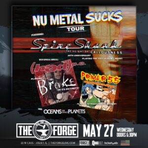 SPINESHANK, (HED) P.E., PRIMER 55, OCEANS ON OTHER PLANETS Rodney Pawlak SPINESHANK, (HED) P.E., PRIMER 55, OCEANS ON OTHER PLANETS When Wed, May 27 6:30 pm Add To Calendar Download ICS Google Calendar iCalendar Office 365 Outlook Live Where The Forge 22 W Cass St, Joliet, Illinois, 60432 Event Type All Ages Loading Map.... 22 W Cass St - JolietEvents 41.52764 -88.082067 NU METAL SUCKS TOUR Spineshank (hed) p.e. Primer 55 Oceans On Other Planets May 27th, 2026 tickets: https://tinyurl.com/363c3n9z
