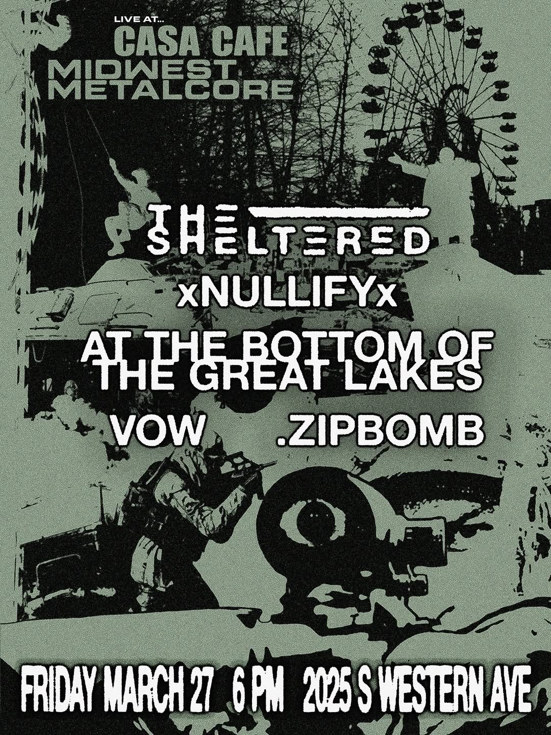 THE SHELTERED, XNULLIFYX, AT THE BOTTOM OF THE GREAT LAKES, VOW, .ZIPBOMB sam farmer THE SHELTERED, XNULLIFYX, AT THE BOTTOM OF THE GREAT LAKES, VOW, .ZIPBOMB When Fri, March 27 6:00 pm Add To Calendar Download ICS Google Calendar iCalendar Office 365 Outlook Live Where Casa Cafe 2025 S Western Ave, Chicago, Illinois, 60608 Event Type All Ages Map Unavailable MIDWEST METALCORE LIVE @ CASA CAFE THE SHELTERED, XNULLIFYX, AT THE BOTTOM OF THE GREAT LAKES, VOW, .ZIPBOMB 6PM DOORS ALL AGES 2025 S WESTERN AVE CHICAGO, IL